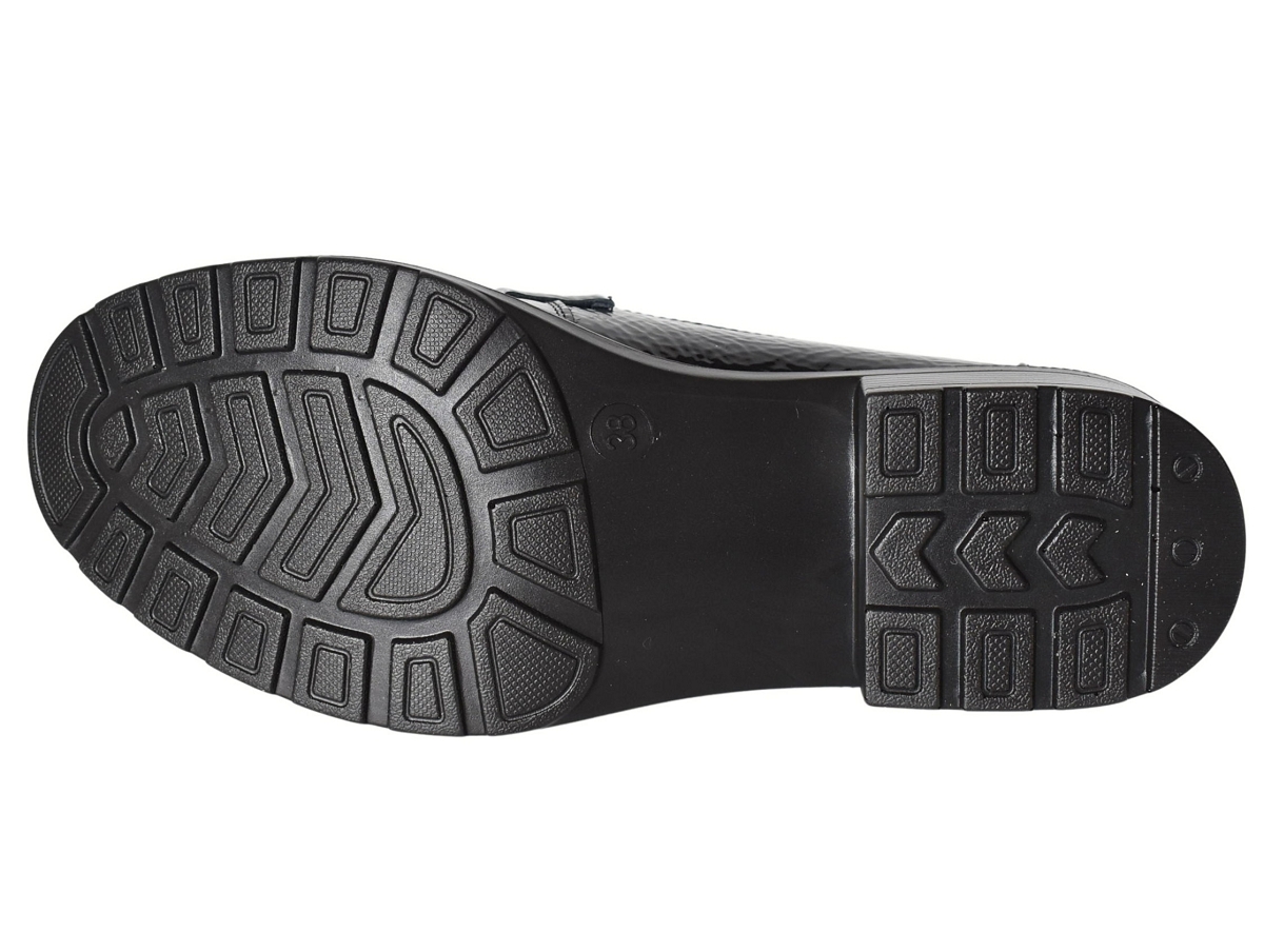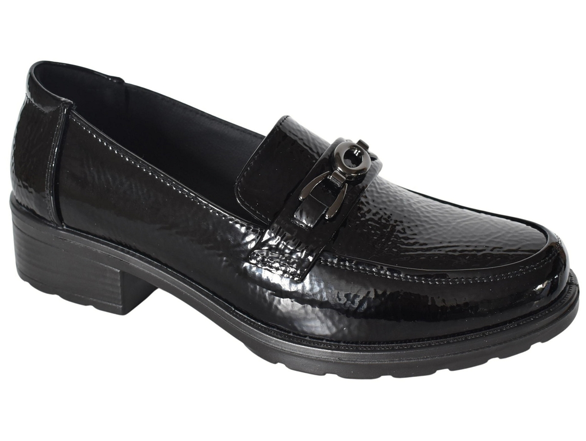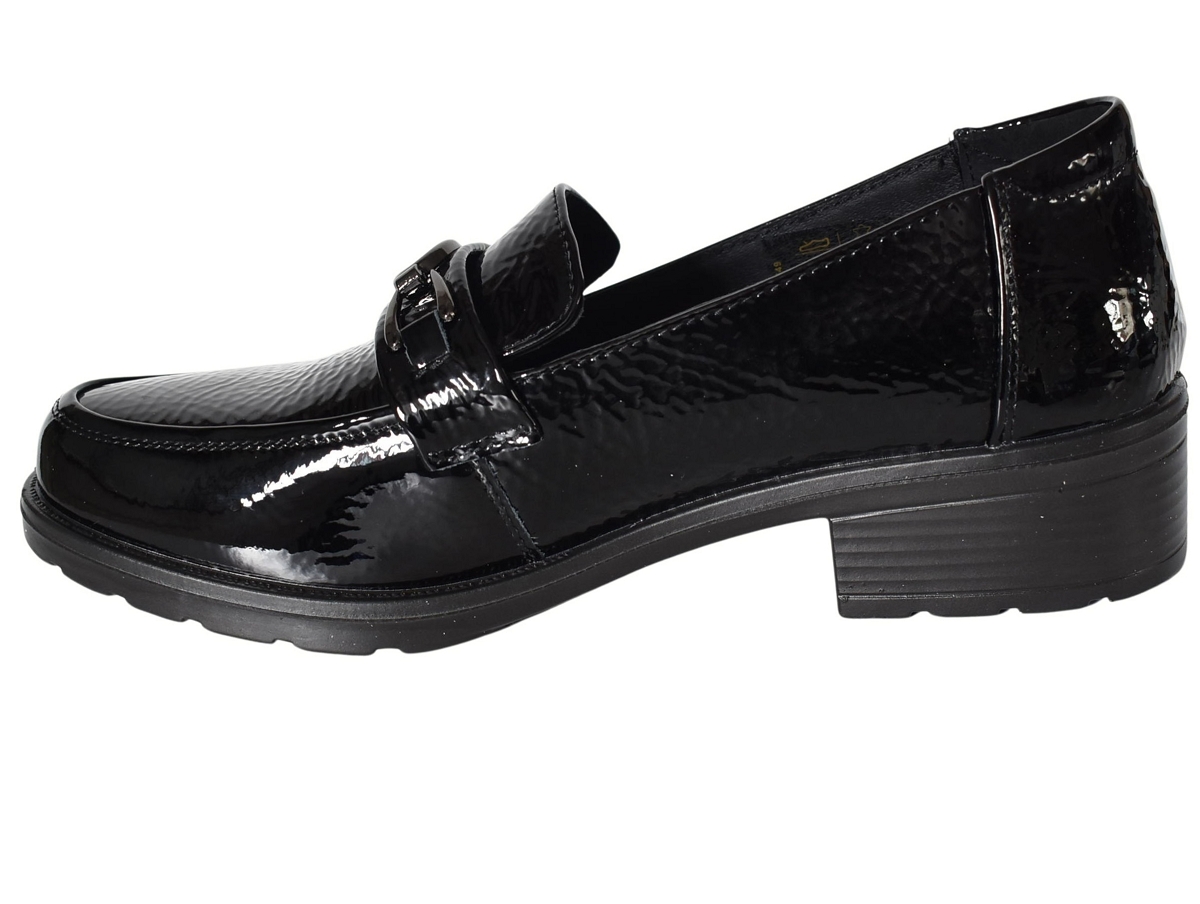 Superbes mocassins en cuir vernis montés sur un petit talon carré.