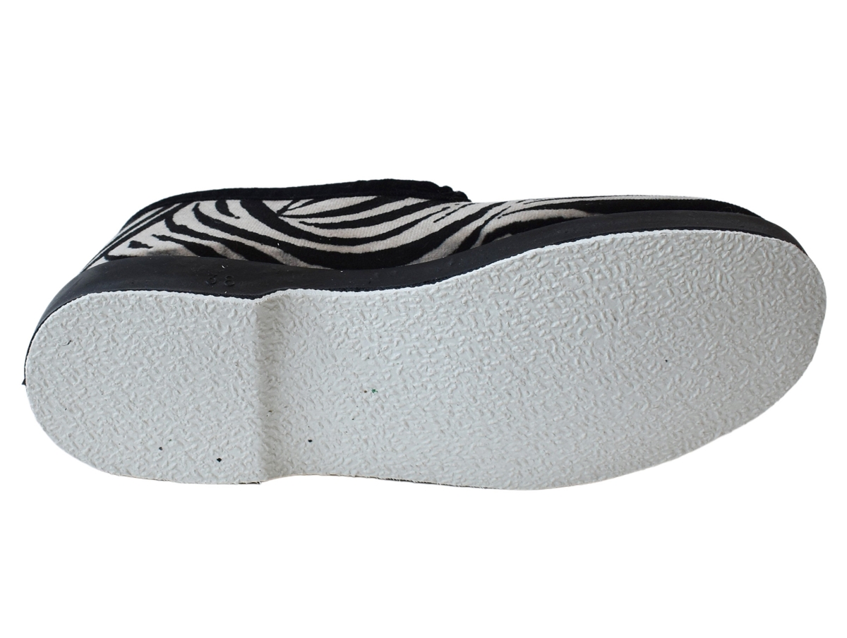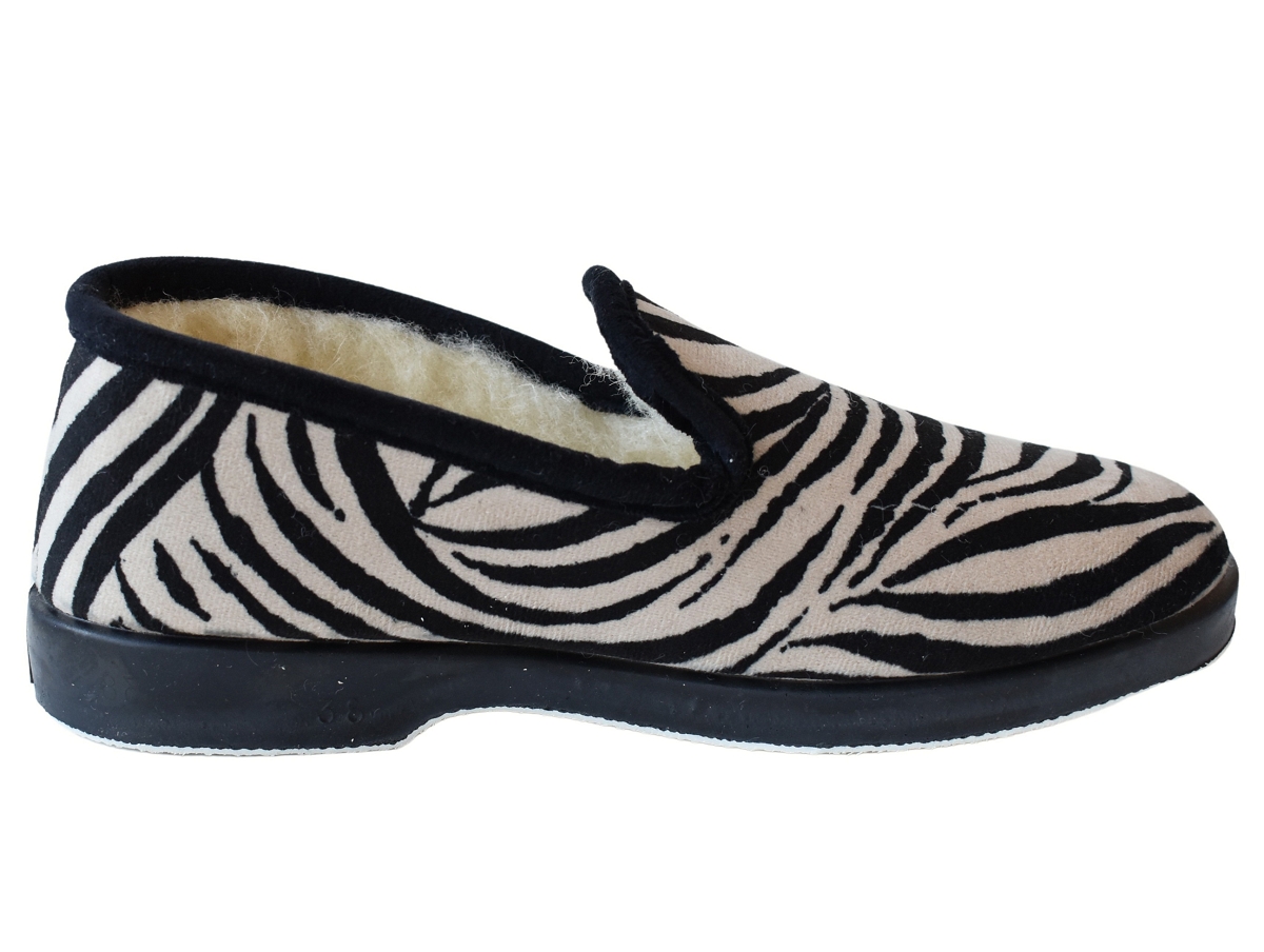 Chaussons de type charentaises en textile velour imprimé zèbre.